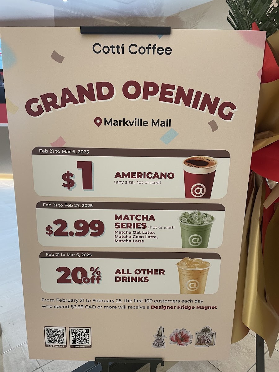 Welcome to Cotti Coffee - Markham, the latest gem in the heart of Ontario, nestled in Markville Mall. Renowned for its rich and flavorful coffee, this trendy spot offers a cozy atmosphere perfect for both work and relaxation. Customers rave about the coconut latte and matcha oat latte, alongside enticing daily specials like the Cloud Mousse Matcha latte.